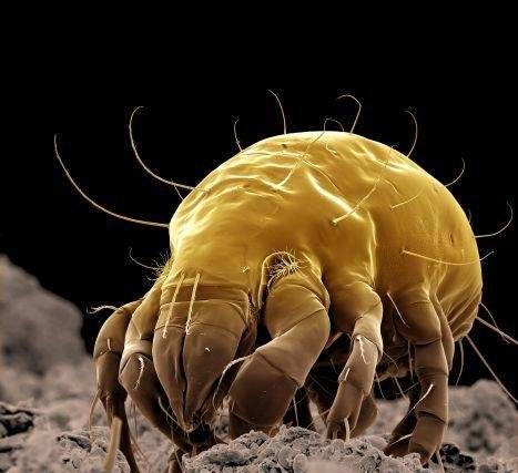 3. Клещ домашней пыли живёт в каждой квартире. Это микроскопически малый жучёк размером 0,3-0,4 мм. Сегодня насчитывается около 150 видов домашних клещей. Идеальная среда для него - температура воздуха 18-25 град. С и повышенная влажность.